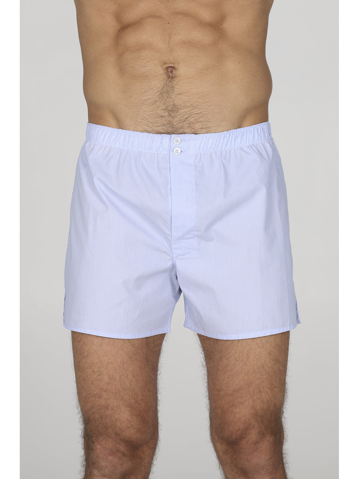 Boxers in excellent shuttle-dyed fabric with blue stripes: naturalness, elegance, and durability are its most important characteristics. Pleasant touch, impeccable fit, for seasonless comfort. Small patterns and traditional stripes.