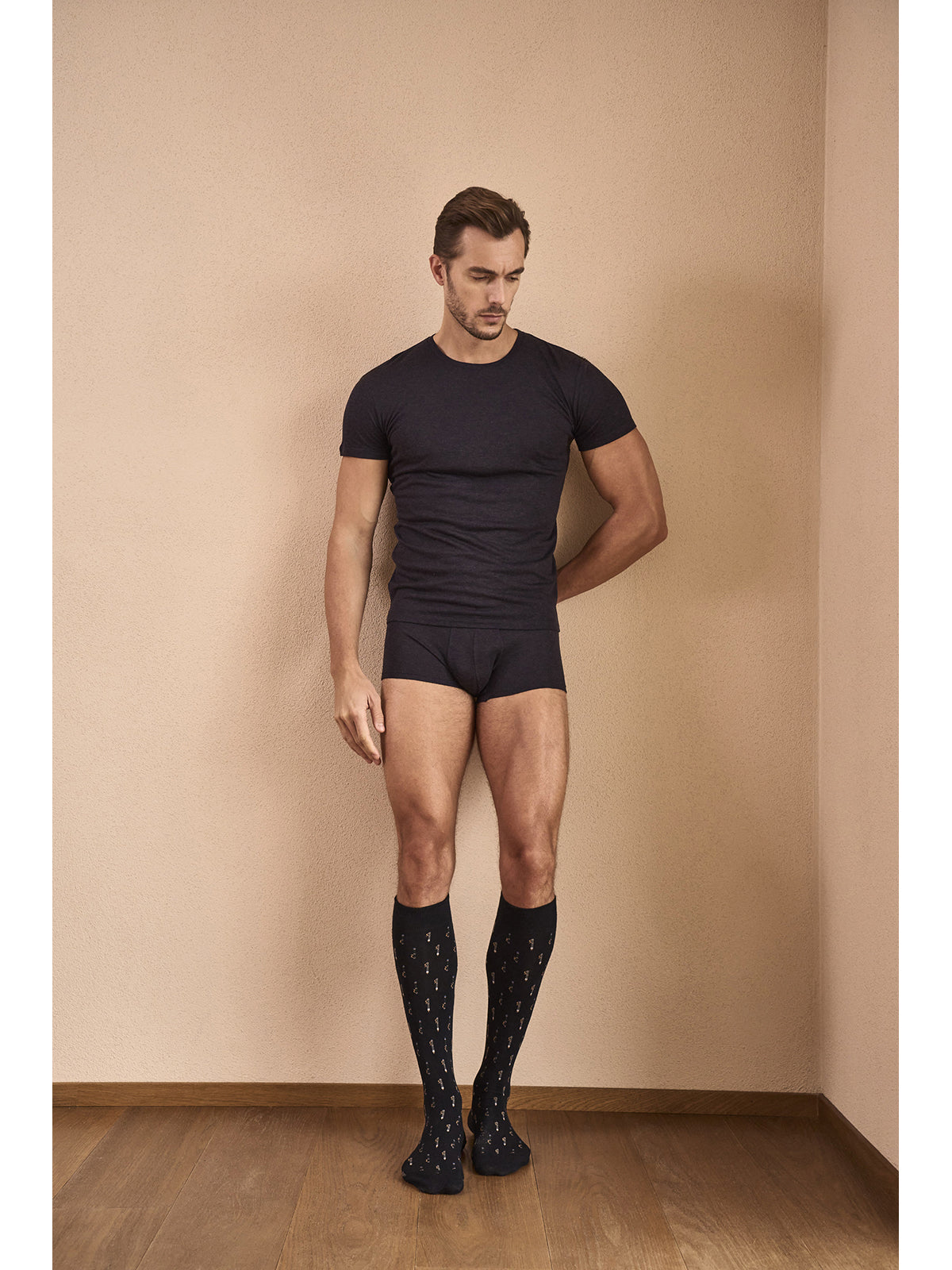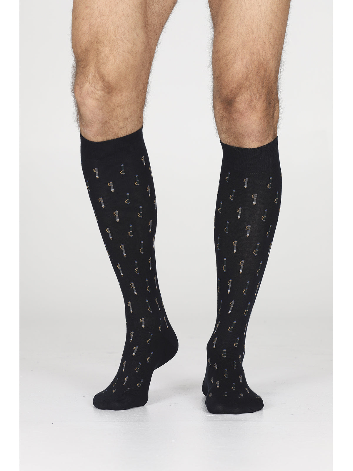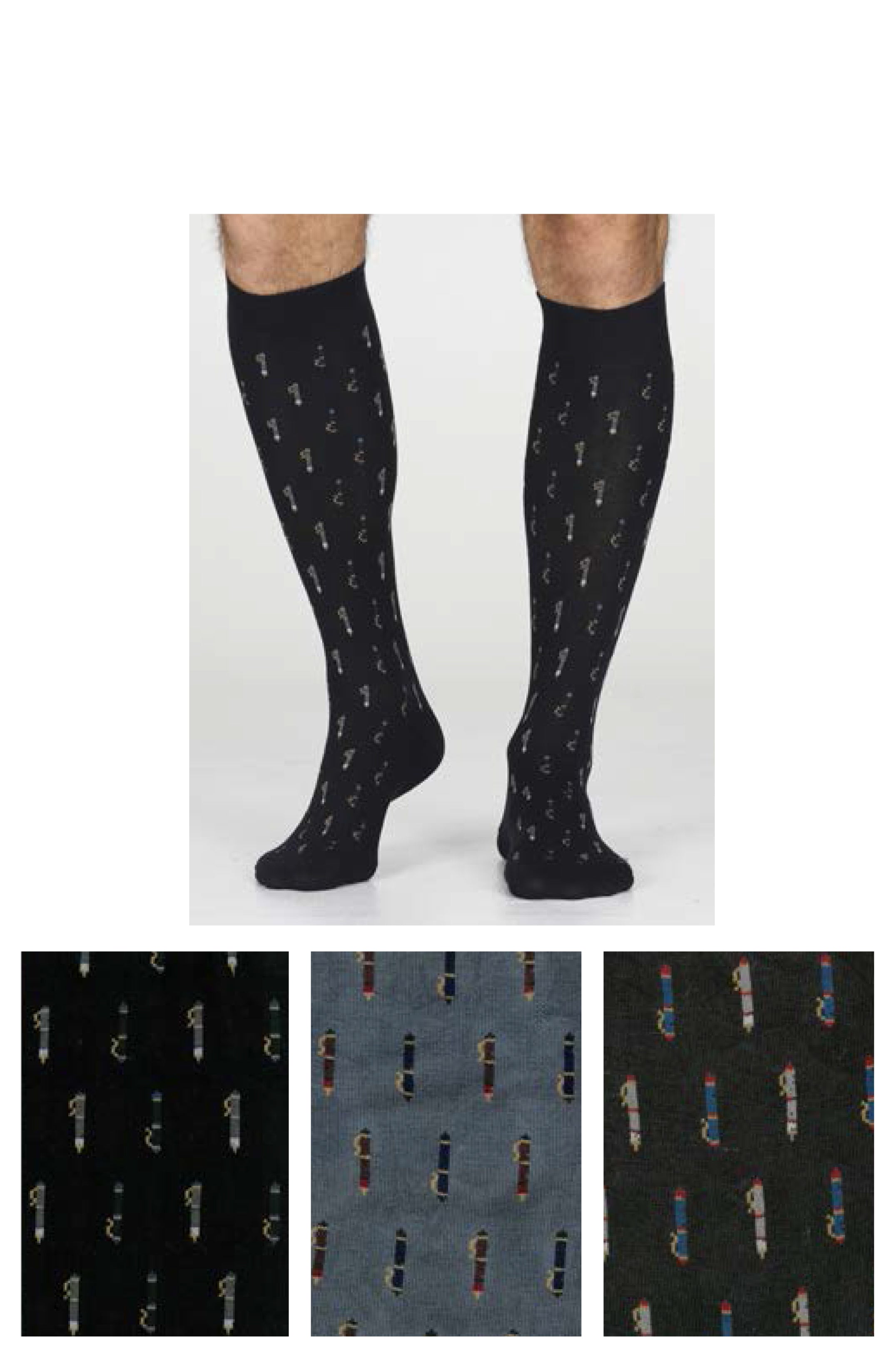 Men's knee-high socks made of warm stretch cotton, featuring 'fountain pen' patterned designs. Coordinatable with the Nogara night line. Reinforced toe and heel. Tripack in assorted classic colors.
