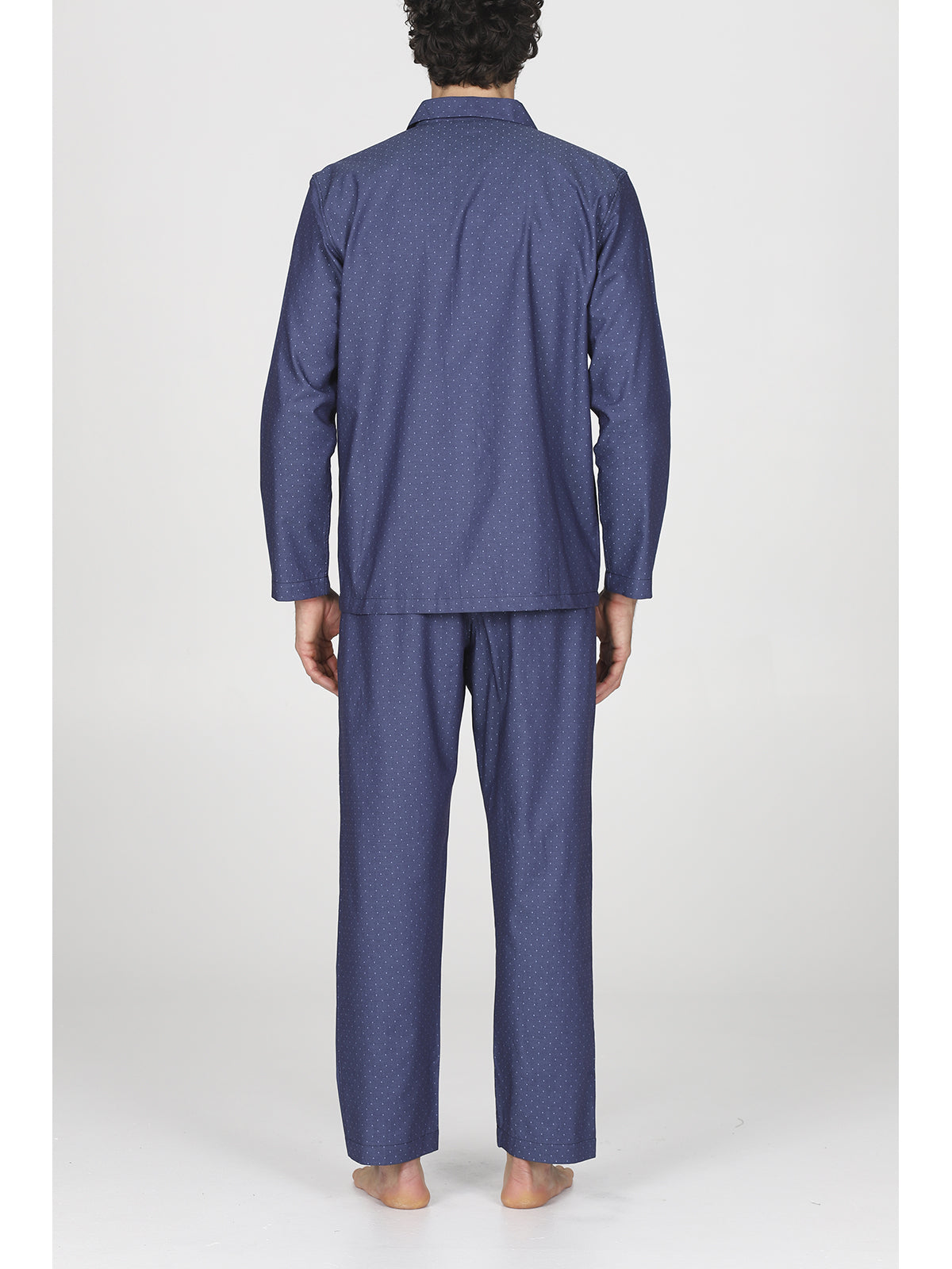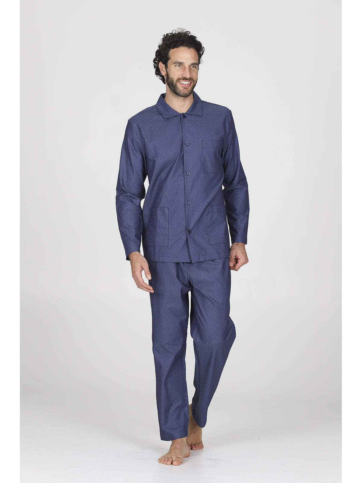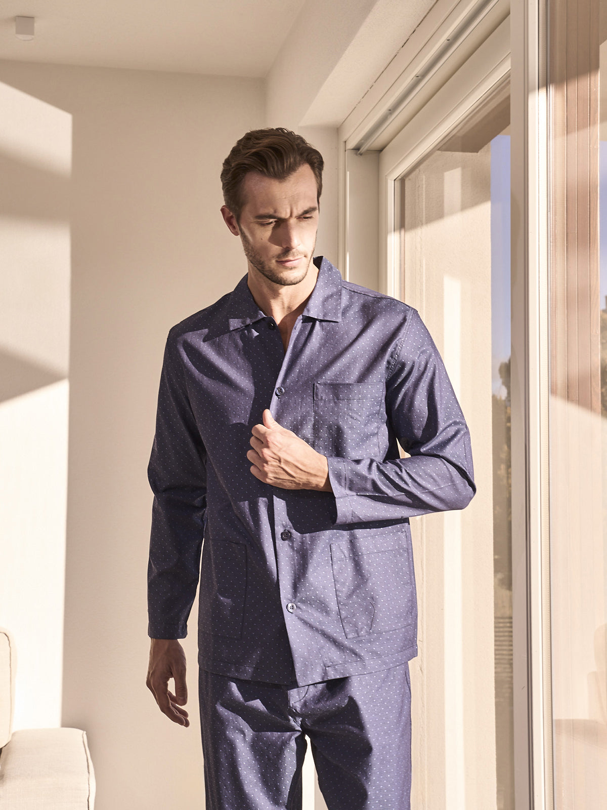 Men's long cardigan pajamas, classic cut in fresh and fine 100% pure cotton poplin dyed in blue yarn, polka dot design. Shirt with three pockets. Pants with button opening. Pleasant touch, impeccable fit, for seasonless comfort.