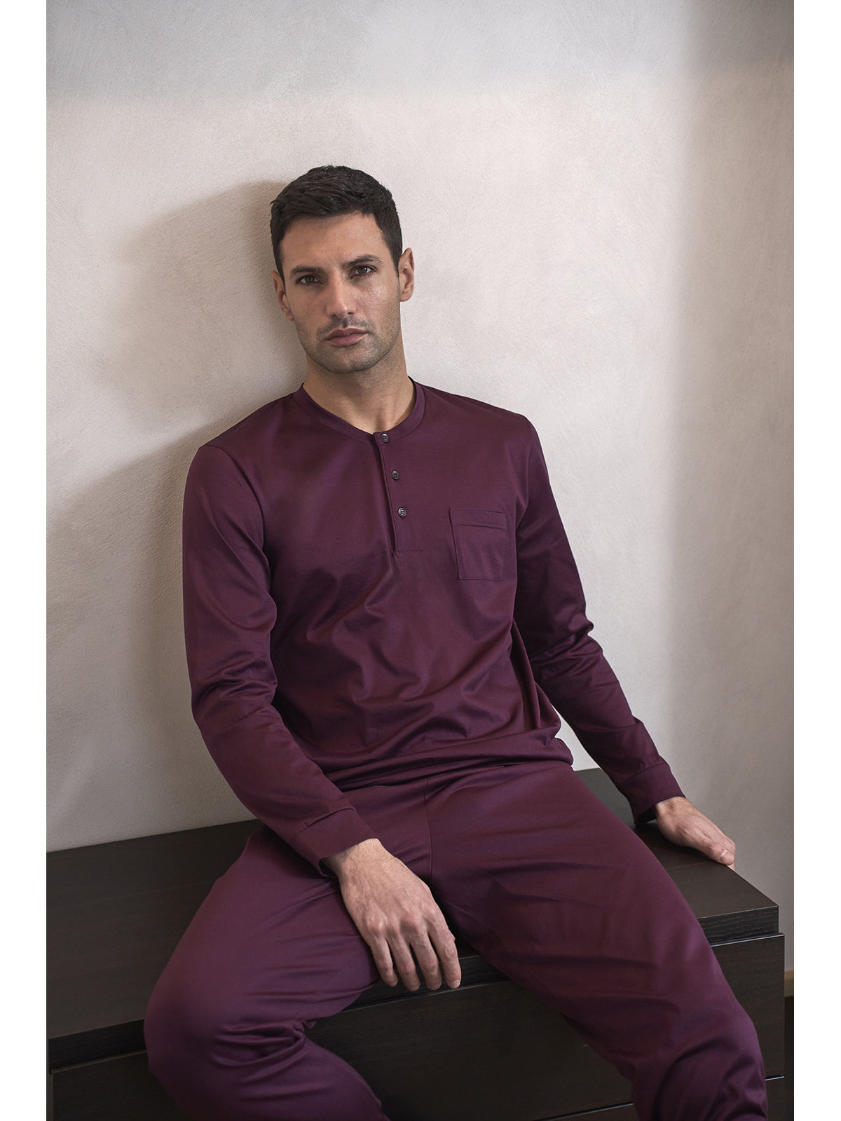 Men's long pajama, in 60/2 pure double-twisted cotton jersey, mercerized in solid bordeaux. Top with henley collar and pocket. Silky, rich, and elegant appearance with a lightweight feel for a perfect blend of comfort and refinement.