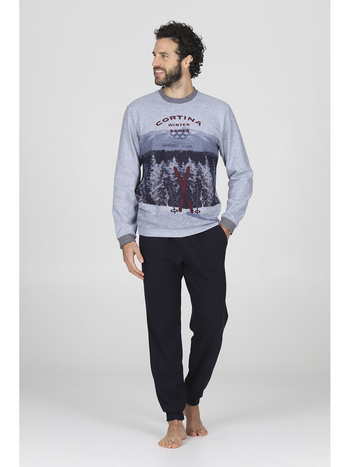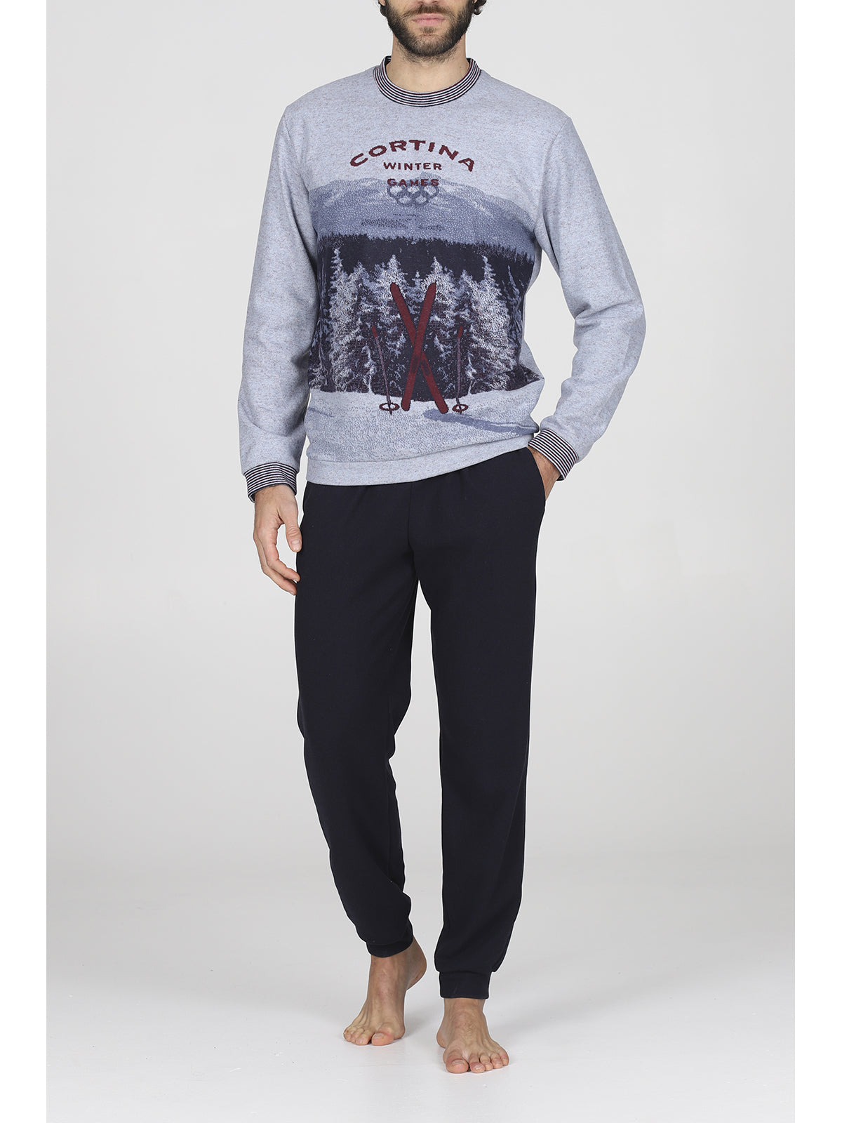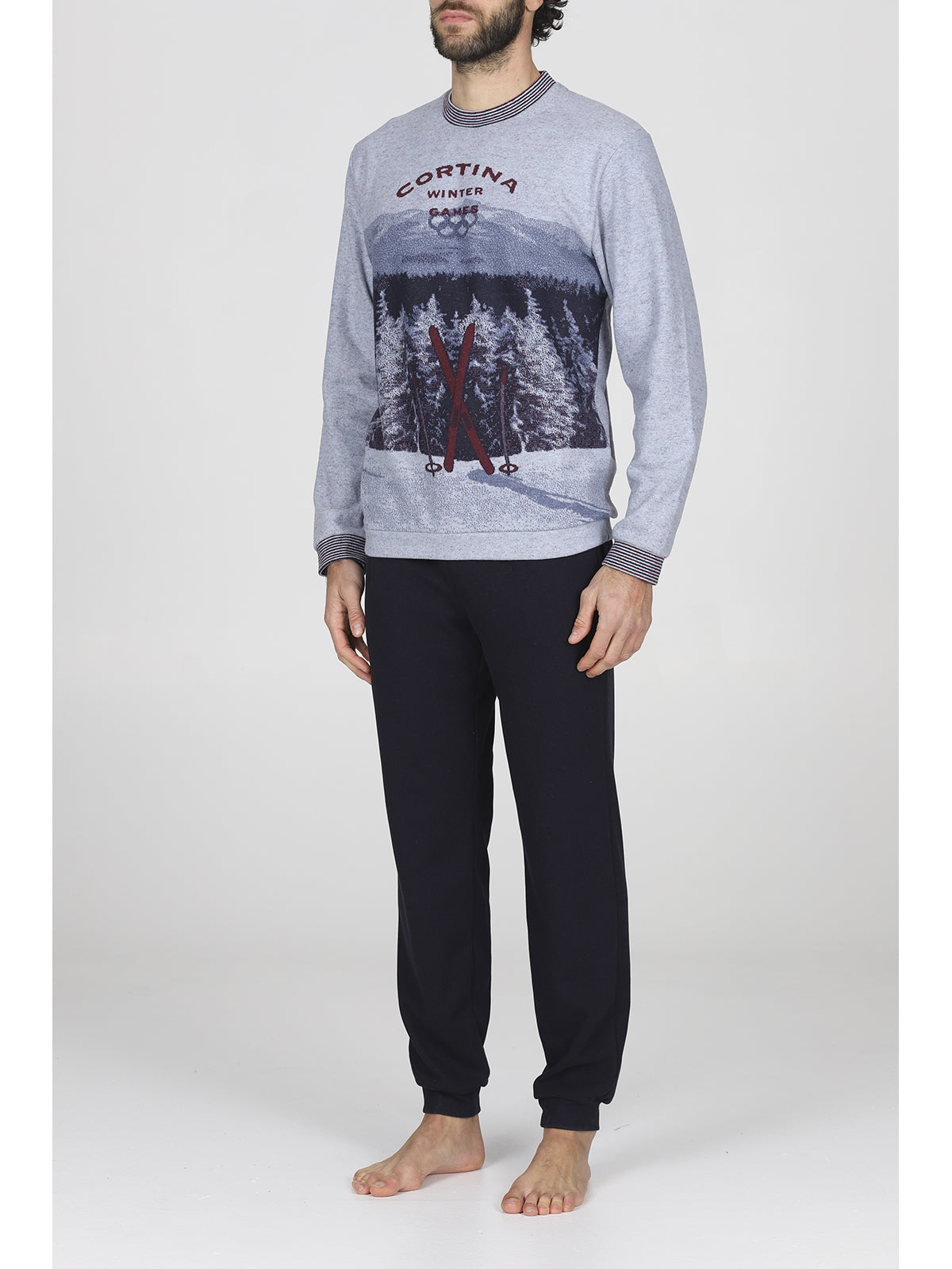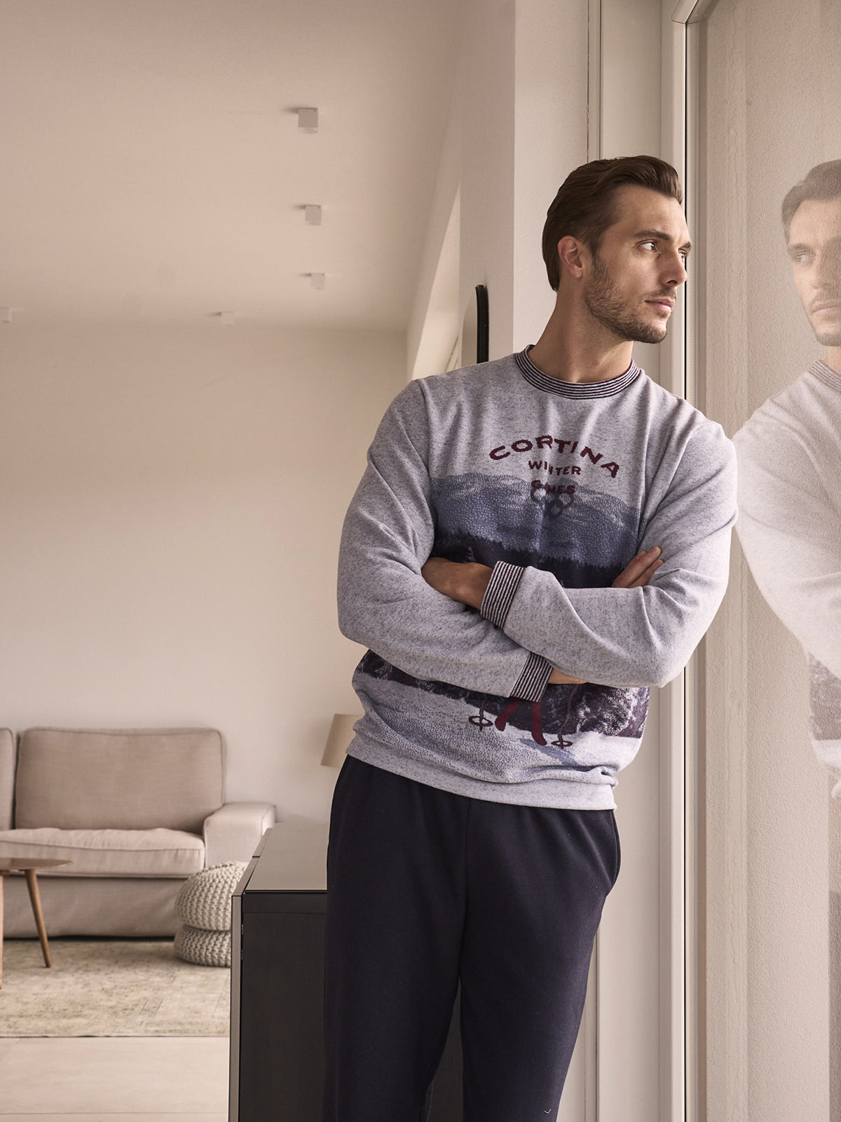 Pigiama uomo in jacquard Ecolife di misto cotone: caldo, elegante e pratico è adatto sia per la notte che al vestire in casa per un massimo comfort. Maglia girocollo con stampa piazzata ispirata ai giochi olimpici invernali Cortina 2026, da cui prende origine l'Artist Edition. Bordure e polsini a contrasto in nuance e dettaglio stemma. Un design ricercato, ideale per l’uomo che ama distinguersi anche a casa.