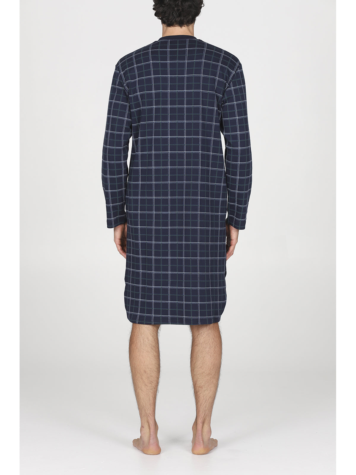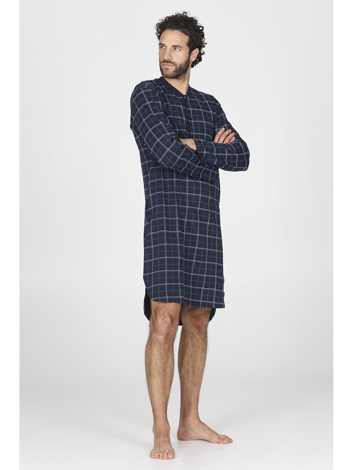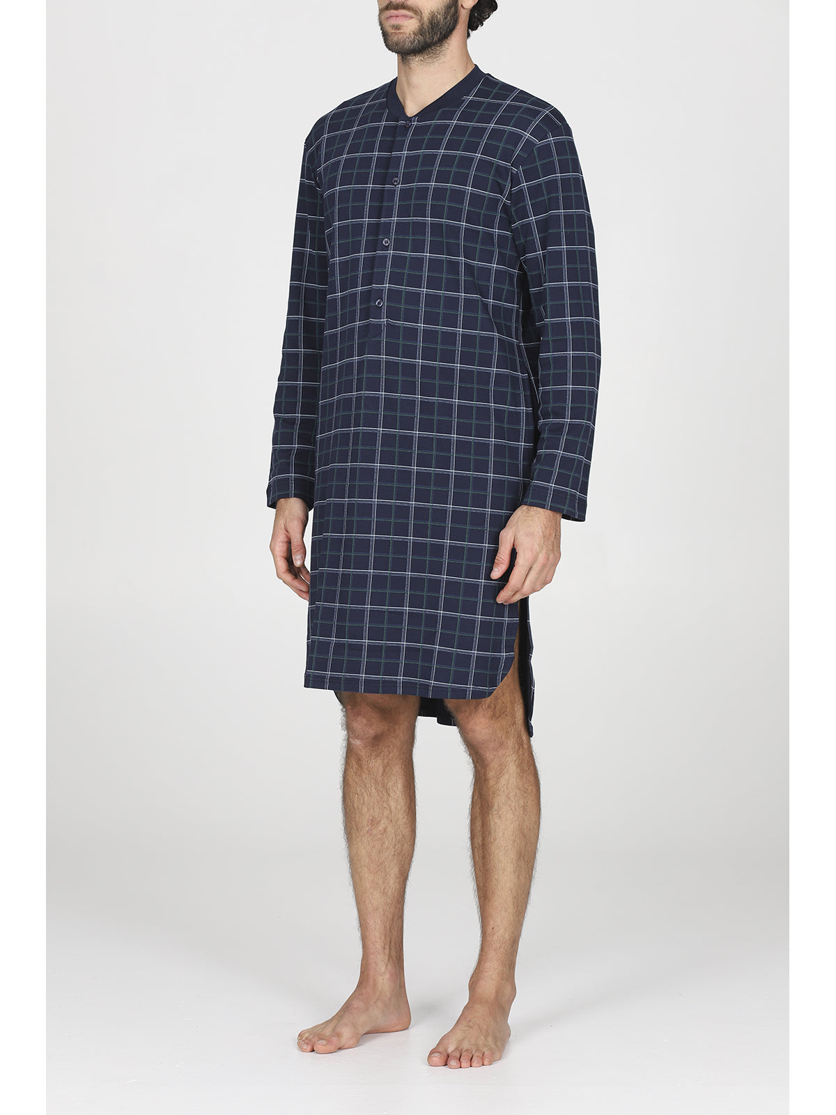 Camicia da notte uomo, in interlock 30/1 di puro cotone. Modello a serafino in fantasia all over a quadri blu. Morbida, calda e naturale è adatto alle stagioni più fredde per un massimo comfort.