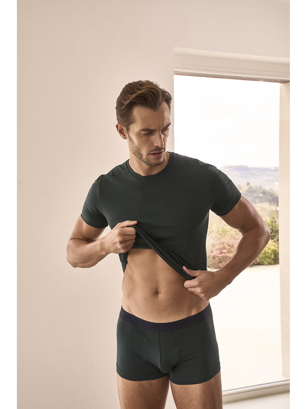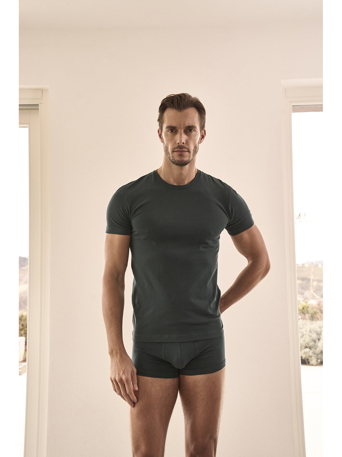 T-shirt uomo girocollo tessuto jersey di cotone elasticizzato verde, con un bassa percentuale di elastan. Pratico, confortevole e sportivo, aderisce al tuo corpo senza stress in totale libertà. Nuova proposta Color della Collezione Intimo Julipet.