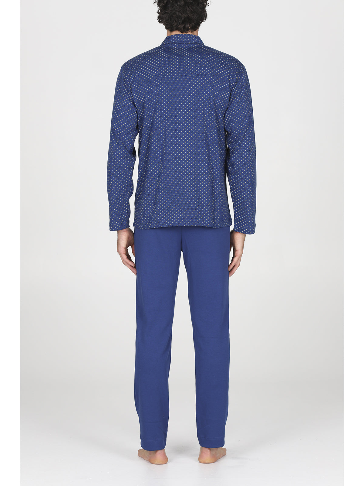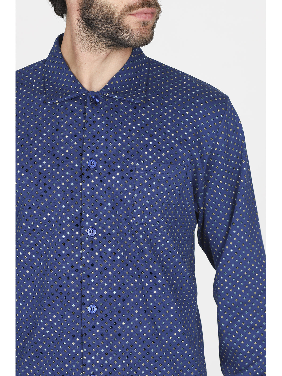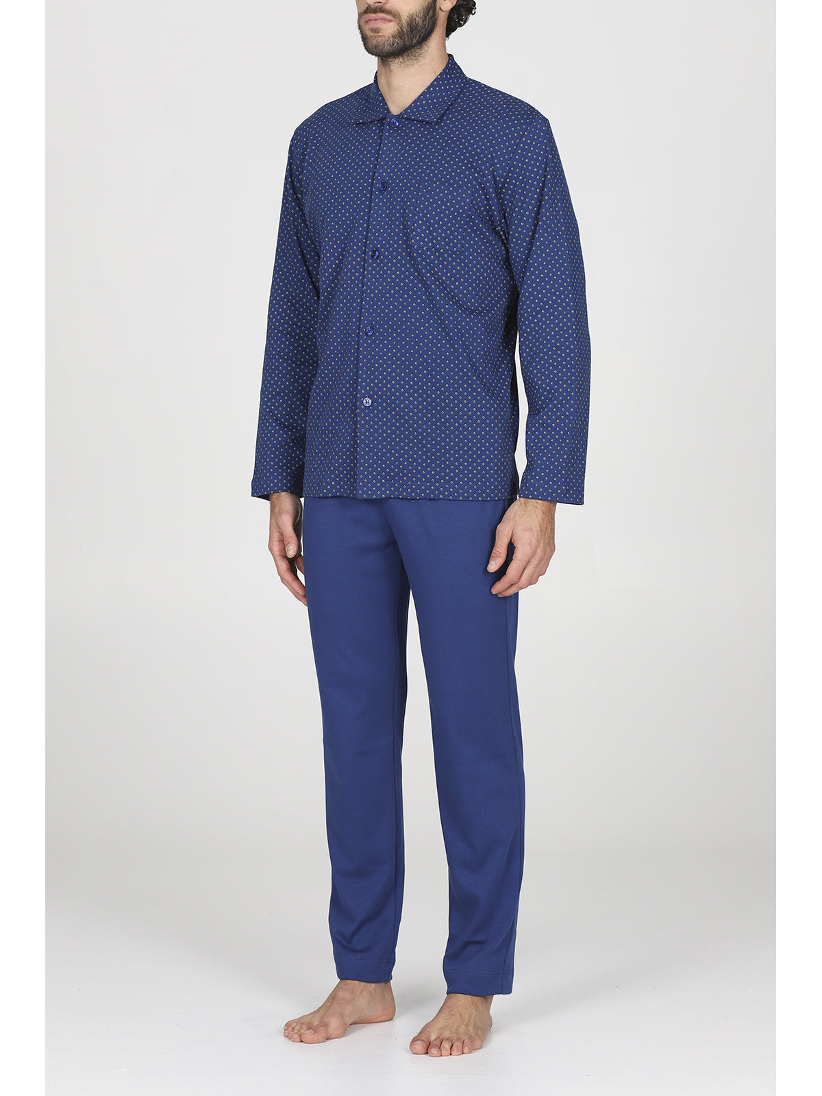 Un'esperienza di comfort e stile si fonde in questo pigiama elegante, realizzato in morbido interlock di puro cotone. La fantasia raffinata e il colore blu profondo donano un tocco di classe, mentre il colletto a camicia e i bottoni conferiscono un aspetto curato e sofisticato.