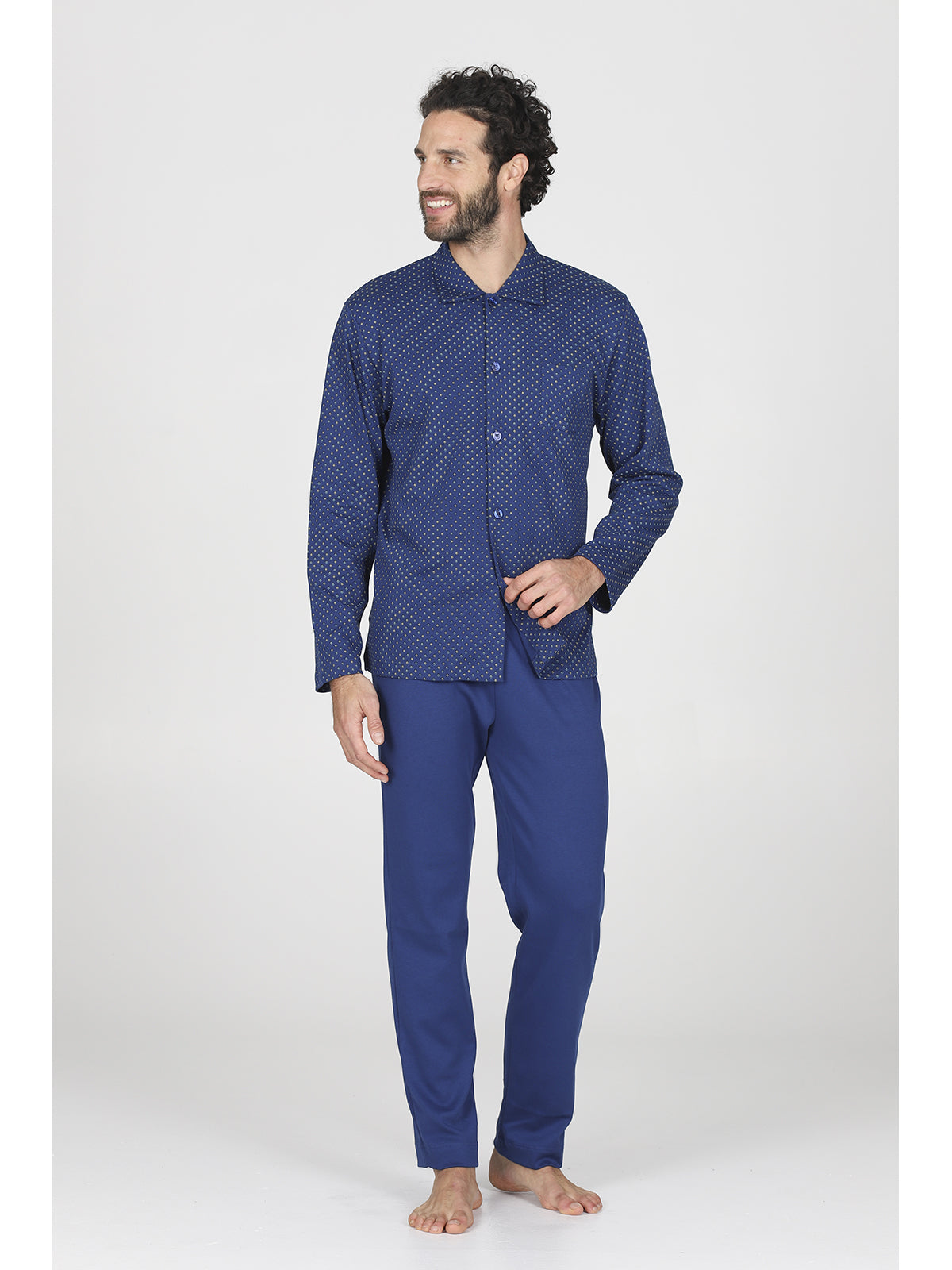 Pigiama lungo cardigan uomo, in interlock 30/1 di puro cotone. Morbido, caldo e naturale è adatto alle stagioni più fredde per un massimo comfort. Maglia cardigan in fantasia rombo bluette e pantalone in tinta unita, senza polsini.
