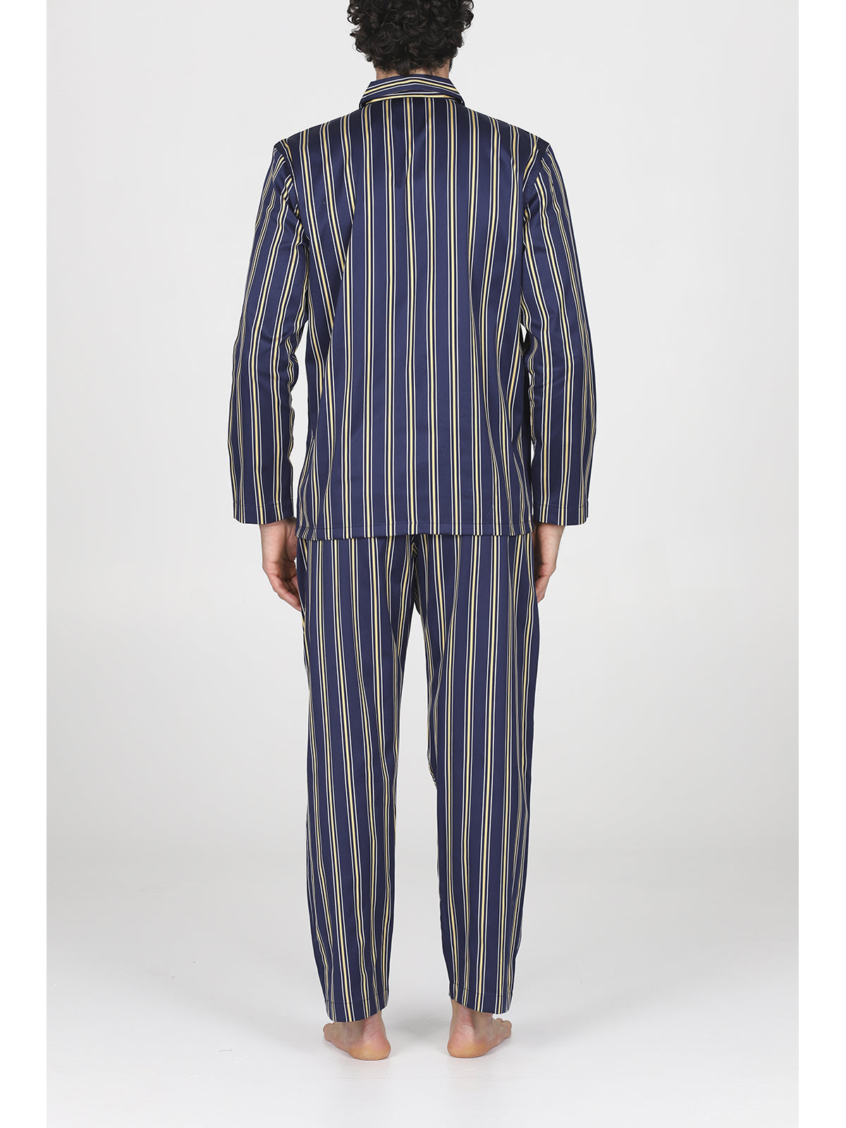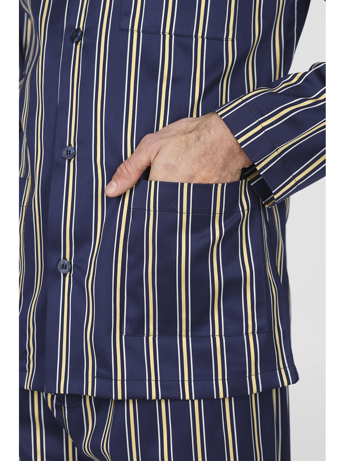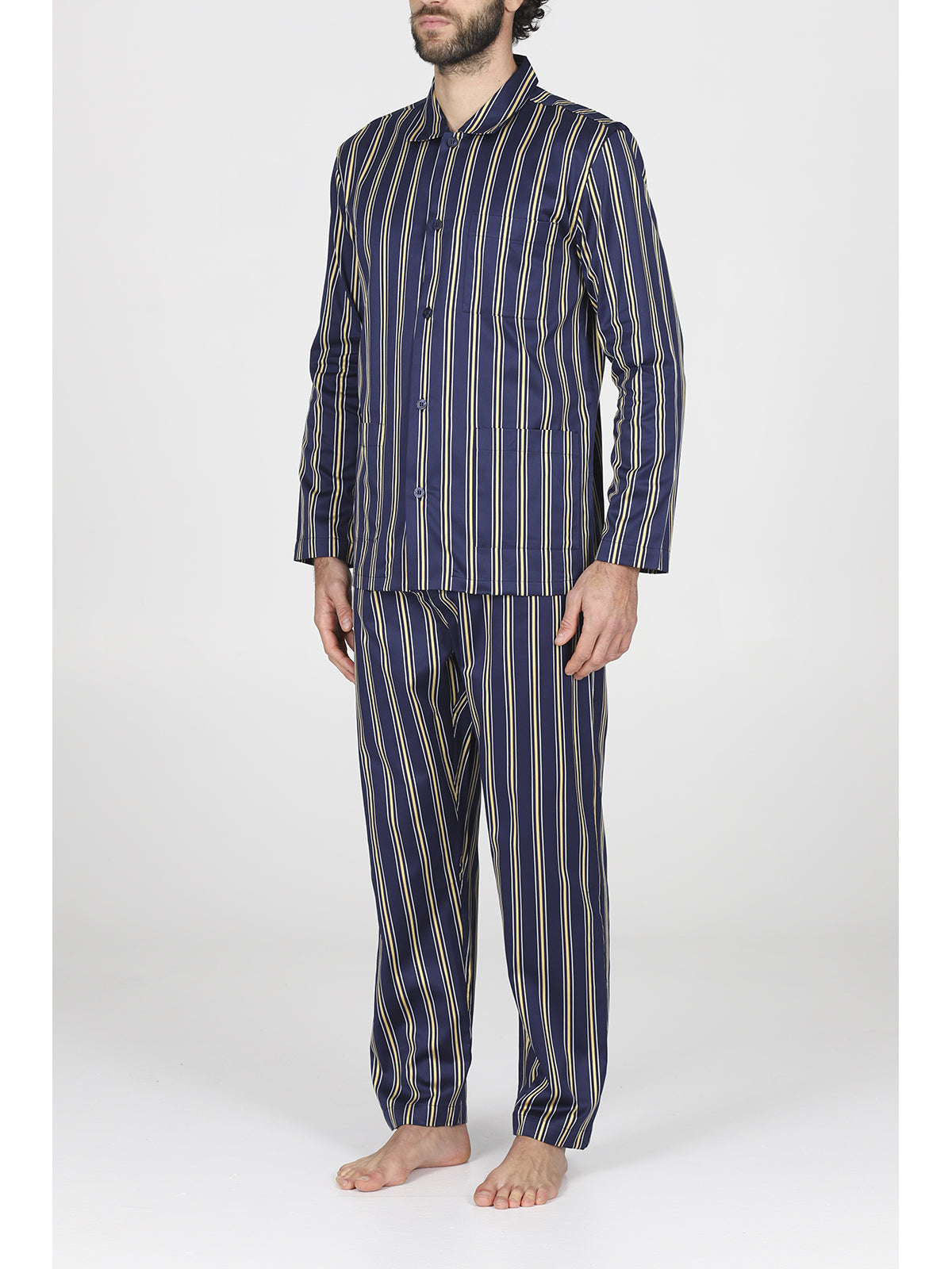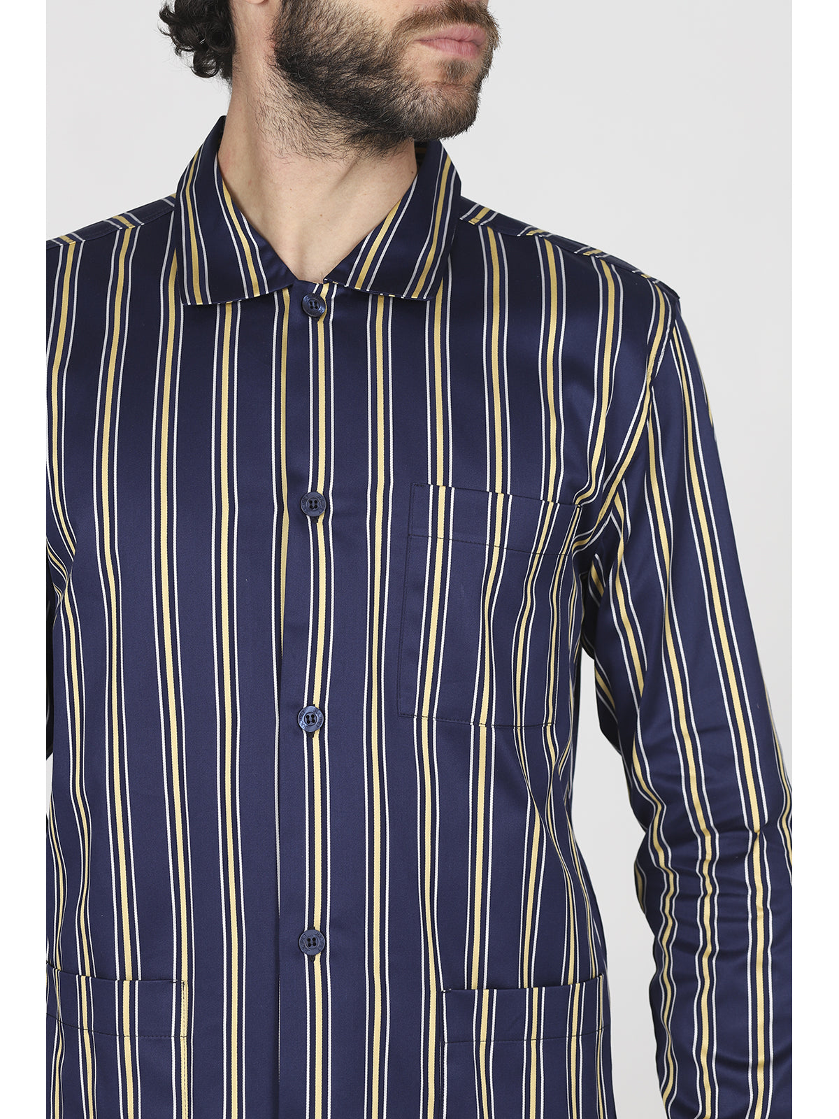 Pigiama lungo a cardigan, dal taglio classico in pregiato popeline tinto in filo di puro cotone in fantasia rigata blu. Camicia a tre tasche. Pantaloni con apertura bottoni. Tocco piacevole, vestibilità impeccabile, per un comfort seasonless.