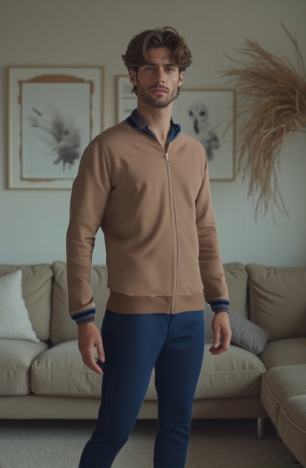 Tuta aperta uomo, con zip in morbidissima felpa di cotone elasticizzato in tinta unita con dettaglio bicolor sulle maniche. Vestibilità confortevole, caratterizzata da un gusto essenziale, contemporaneo e ricercato. Pensata per donare il massimo comfort anche nei tuoi momenti di relax.