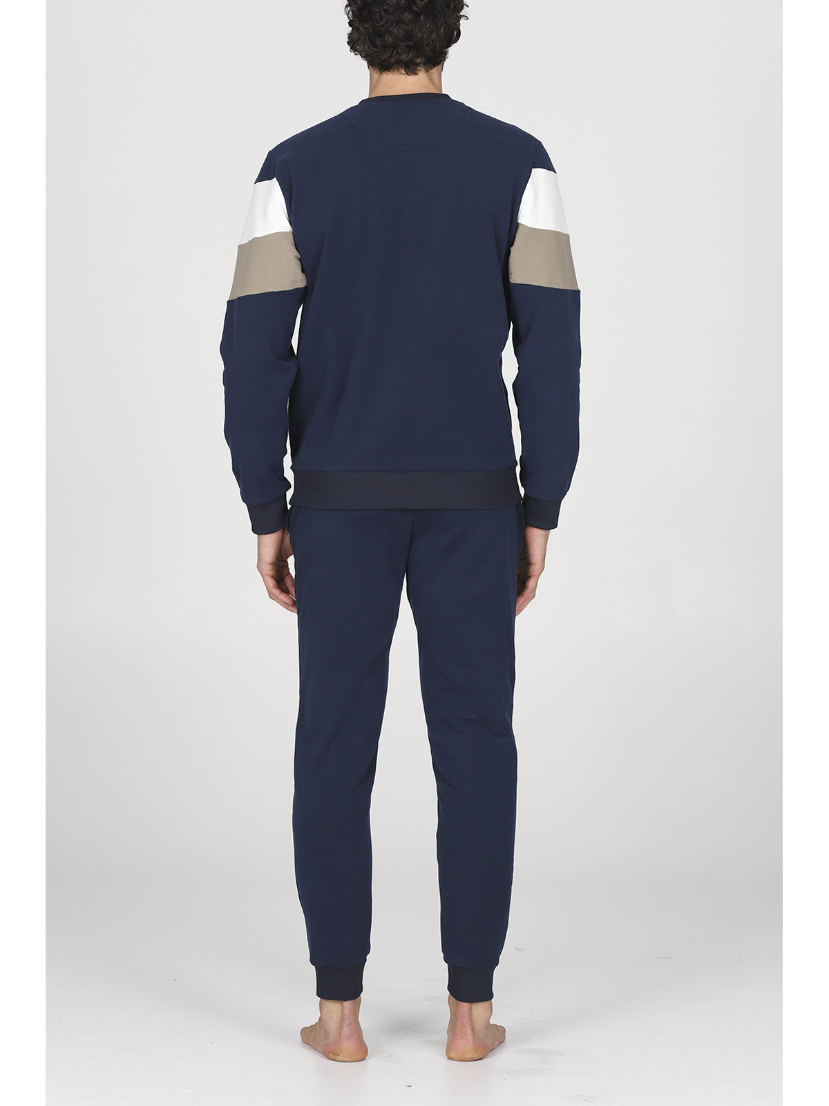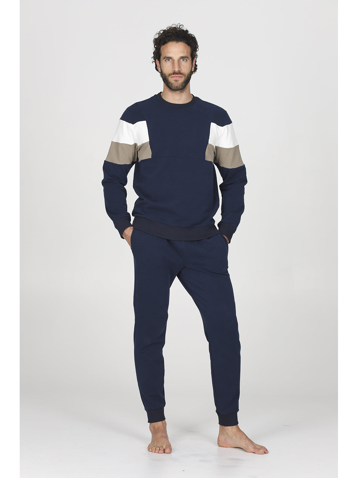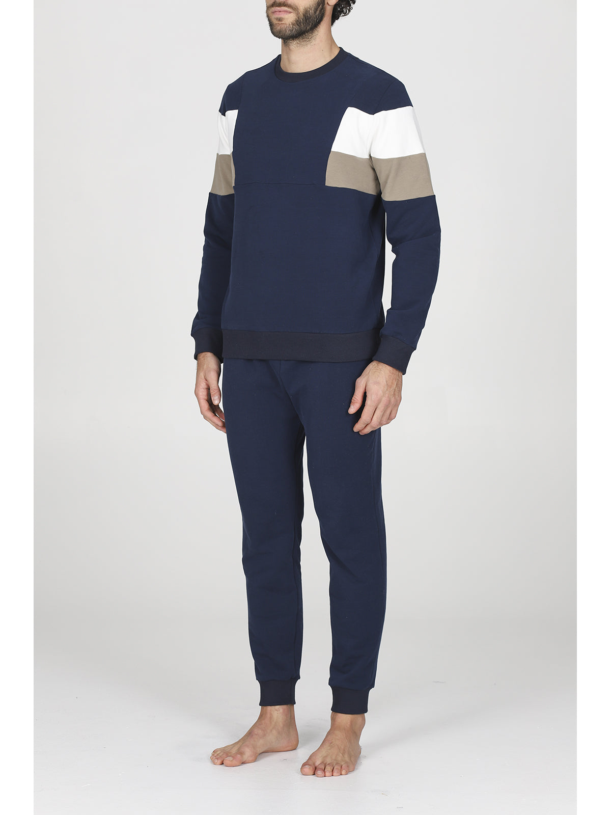 Completo homewear uomo girocollo, in morbidissima felpa di cotone elasticizzato in tinta unita con dettagli a contrasto sulla felpa. Vestibilità confortevole, caratterizzata da un gusto essenziale, contemporaneo e ricercato. Pensata per donare il massimo comfort anche nei tuoi momenti di relax.